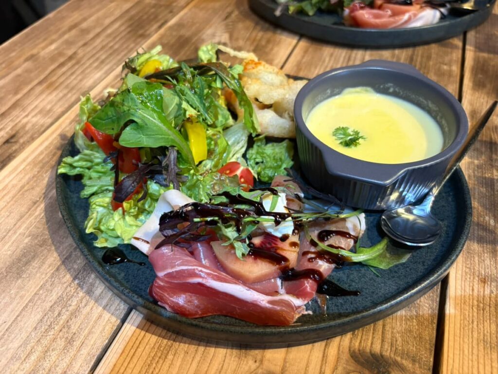 前菜はサラダもスープも乗ったオールコンプリート!